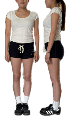 ヒールは8cmと高いですが、真横から見た姿勢を見ると、見事にくるぶしの上に上体(腰~肩から耳)がきれいに乗って、足裏全体でバランス良く身体を支えることができています。真正面からみても、ほぼ左右対称です。腰から頭にかけて少々左に傾いていますが、これまで長い期間、歪んだ姿勢で過ごしてきたため、身体の各所に変なコリがあると思います。足に合った靴を履いて意識的な生活を送ることによって、こうしたコリも徐々に解消して身体全体が整うと思います。
