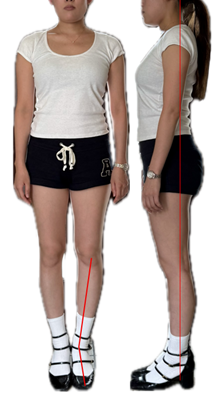 普段はスニーカーを履いているということなので、真横から立位の姿勢を見てみると、腰から頭までの上体がくるぶしより前方になっていることが分かります。更に、腰が湾曲しすぎて、いわゆる反り腰になっています。見るからに腰が痛そうです。