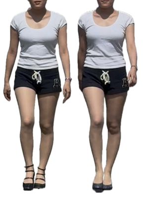 スニーカーよりヒールが高いため、真横から見た姿勢はスニーカーの時以上に前傾になっています。真正面からみると、左足の歪みが相対的に大きいことが良く分かります。結果的に骨盤が右側に押されて、身体全体が歪んでいます。