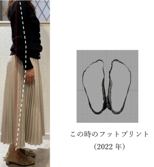 実際の足も当初(2022年)の足よりアーチができたこともあって、姿勢はとても改善されましたが、既成靴では、どうしても大腿骨頭(大転子)の位置がくるぶしの真上には乗せられません。