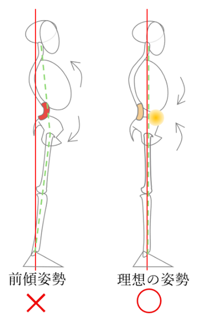 骨盤より上の上体が前に倒れないように、背中や腰、脚などの身体の後ろ側に位置する筋群で一生懸命引っ張らなければならなくなってしまうためです。